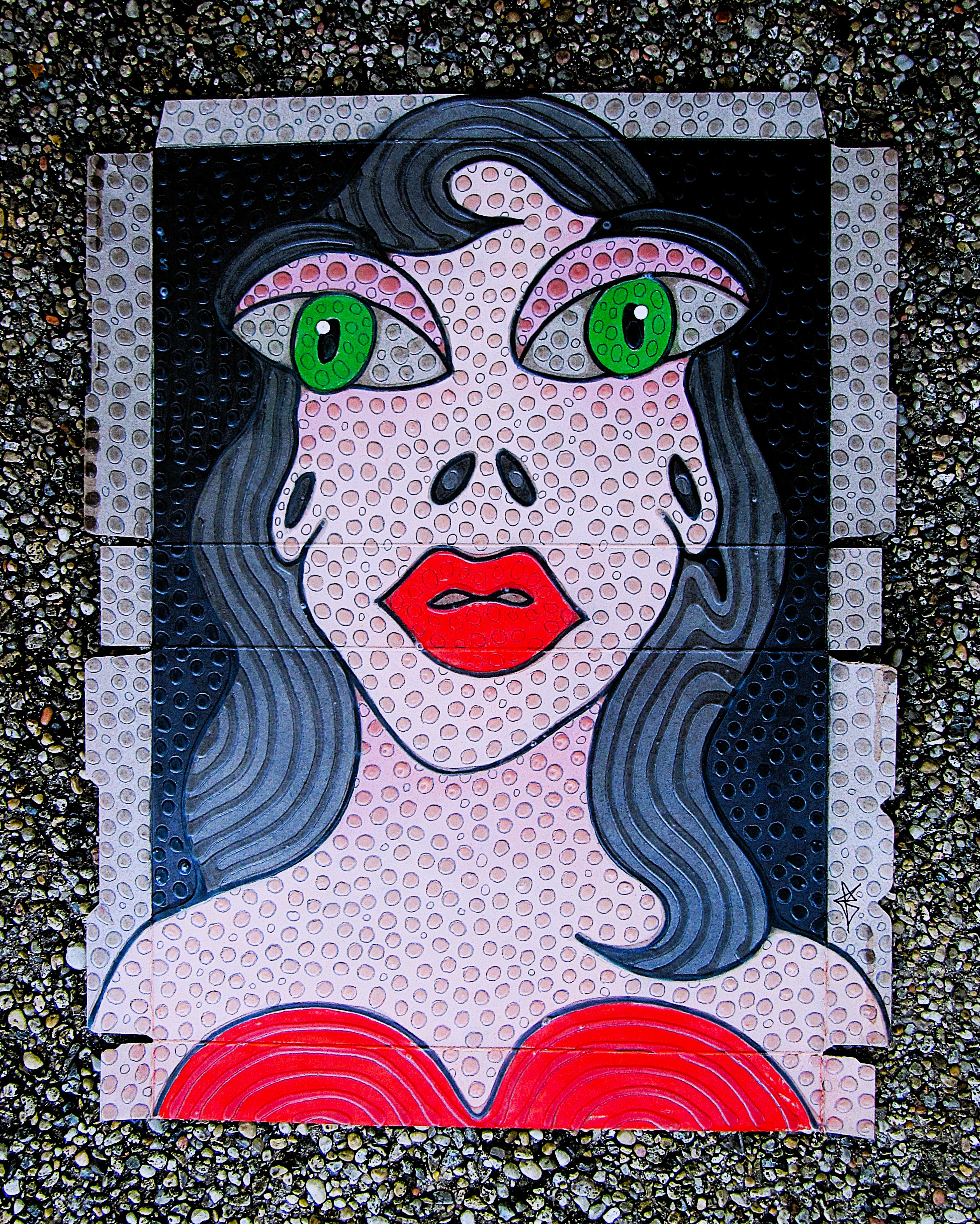 Glue Dot Portrait of Romy Schneider (22 x 17 1/4, Sharpie, glue and pastel on a Mega sized Raisin Bran box) | ||
