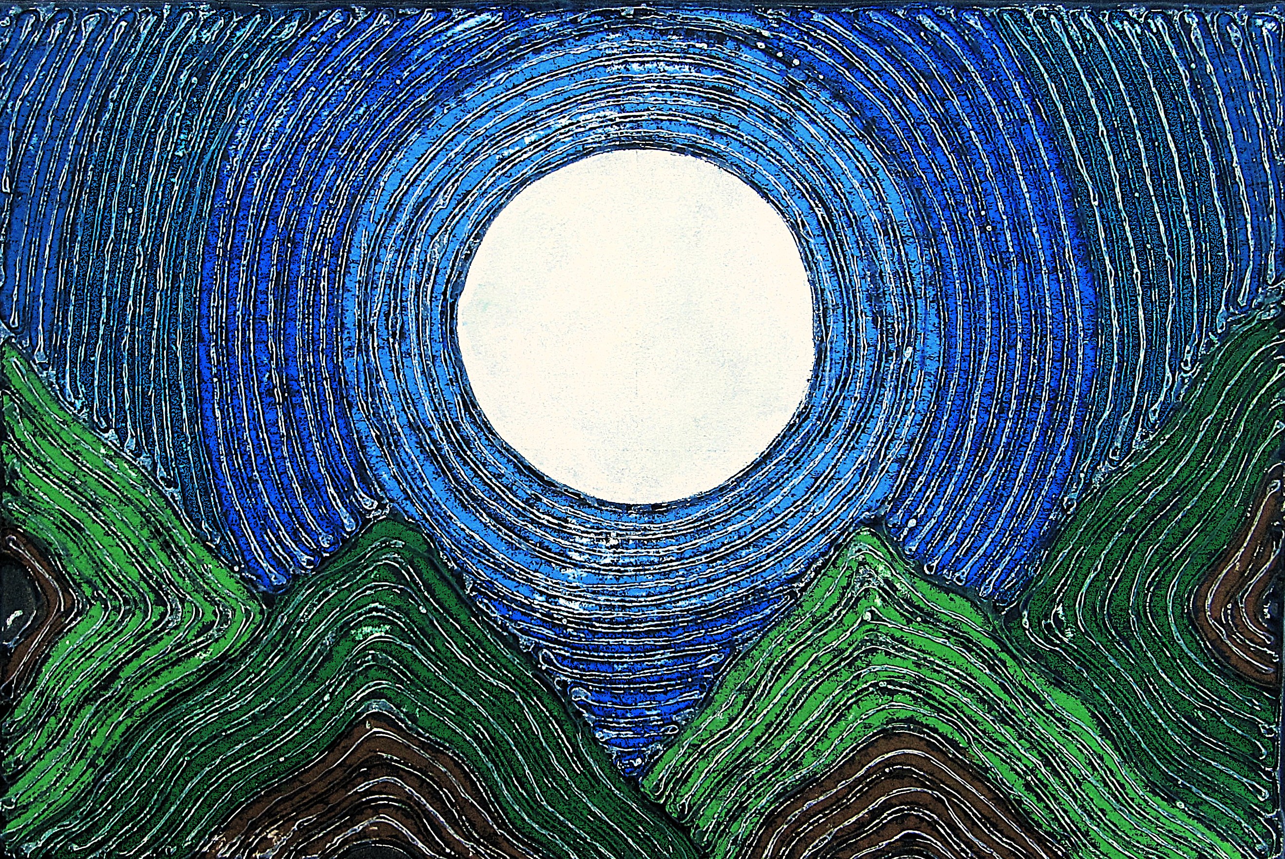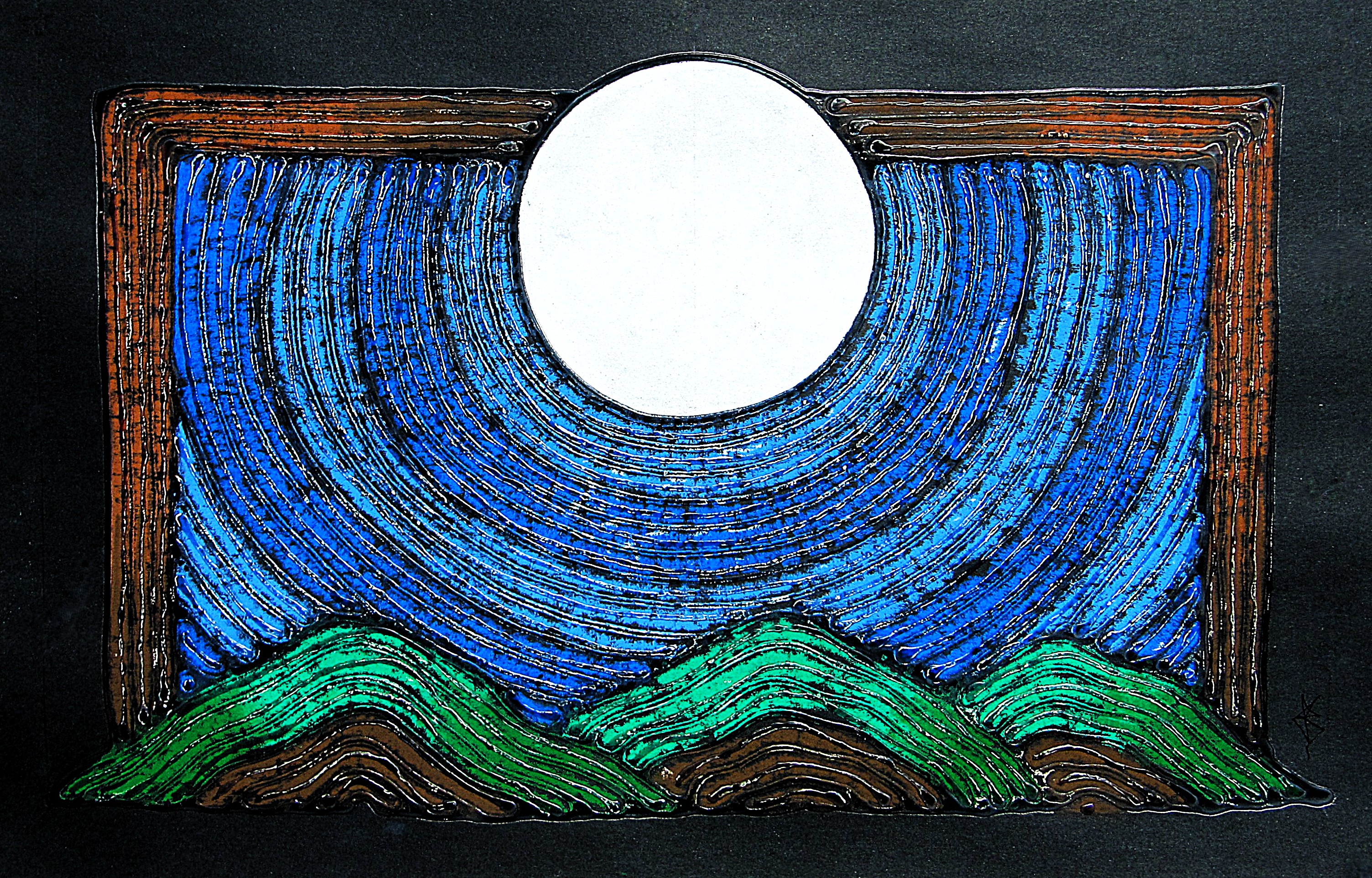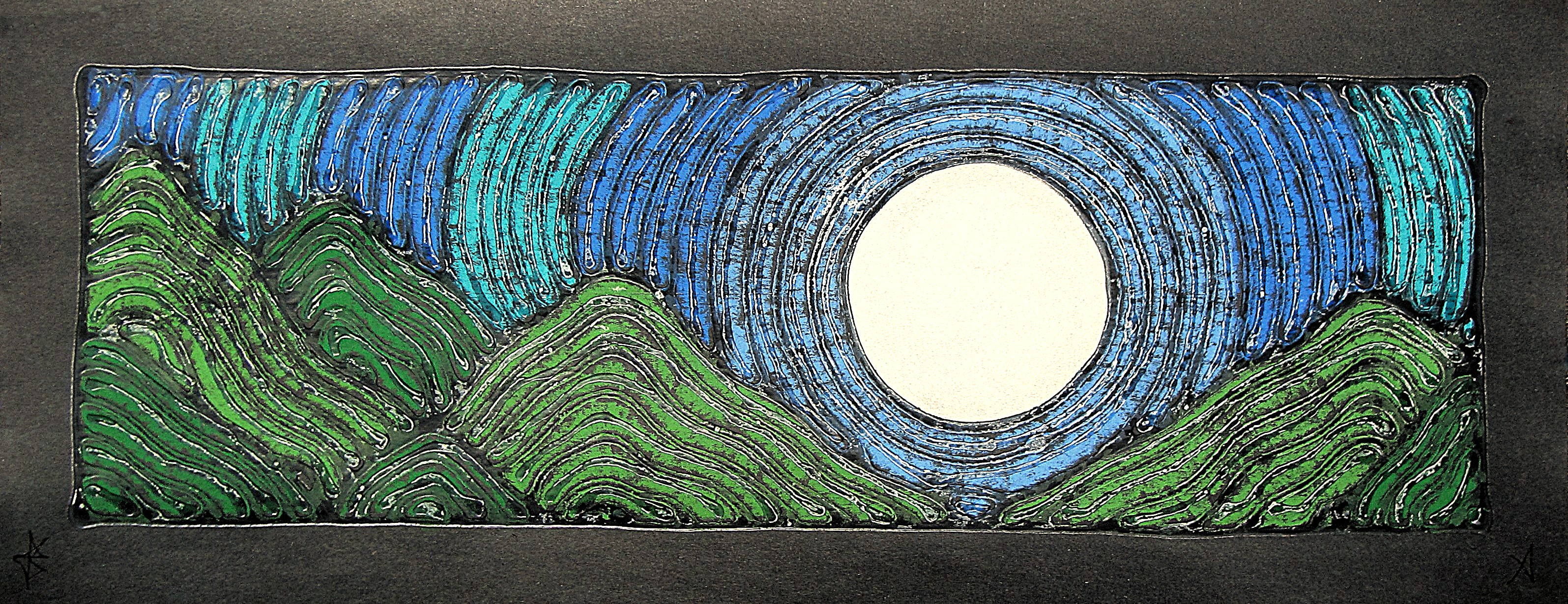 Glue Orb Starry Night with Green Cross-Hatched Hills (22 x 28, glue and pastel on black illustration board) | ||